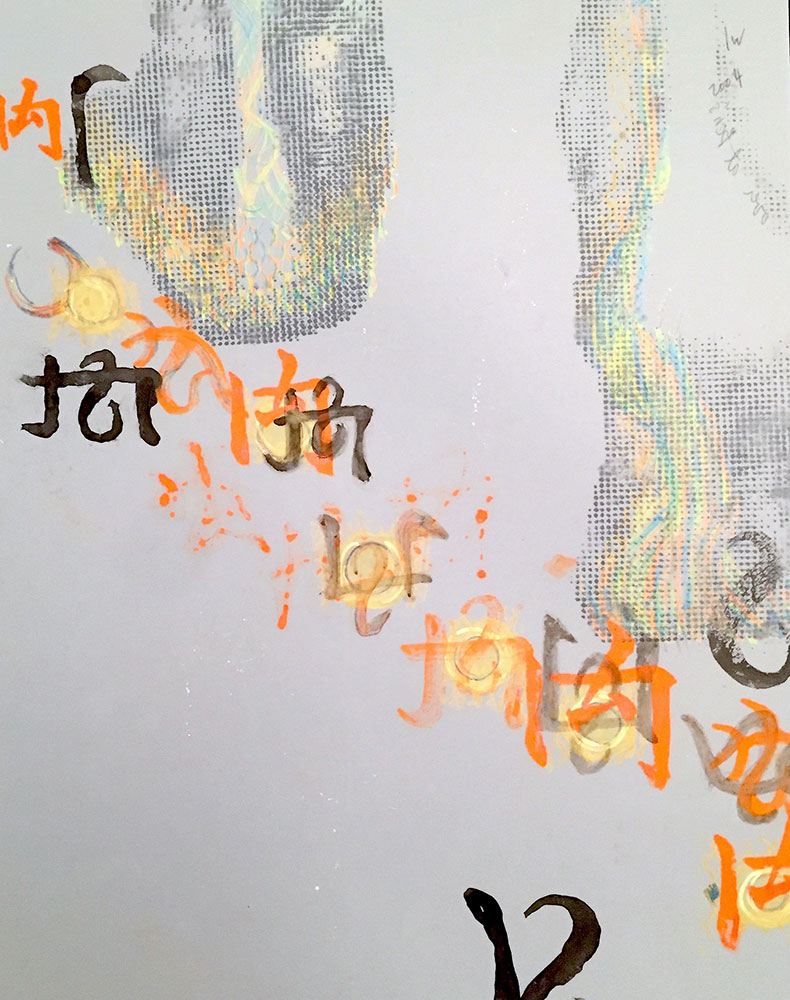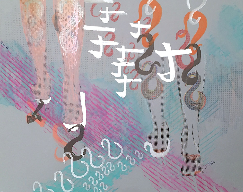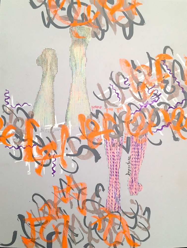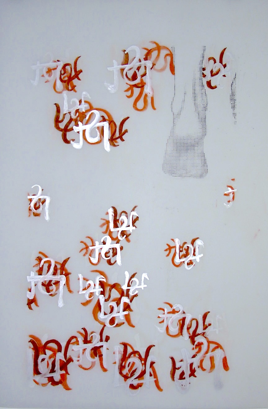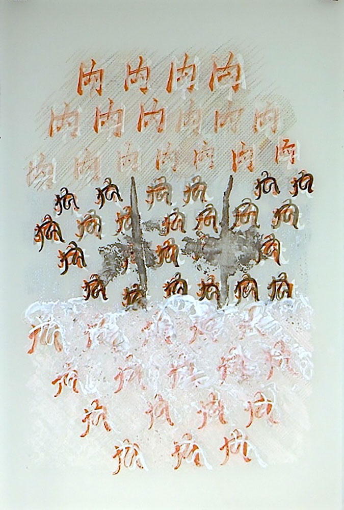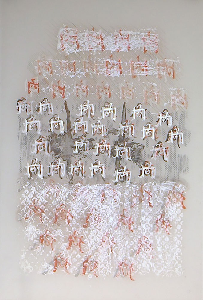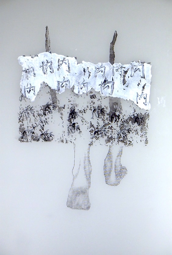 DEPARTURE’s REVERSIBLE PAINTINGS design relationships between a photographic element of human feet walking; and the Chinese ideograms for “to depart”. Over time, the Chinese character for “to depart” evolved into 4 changes, before becoming obsolete and removed from the dictionaries during the Cultural Revolution.