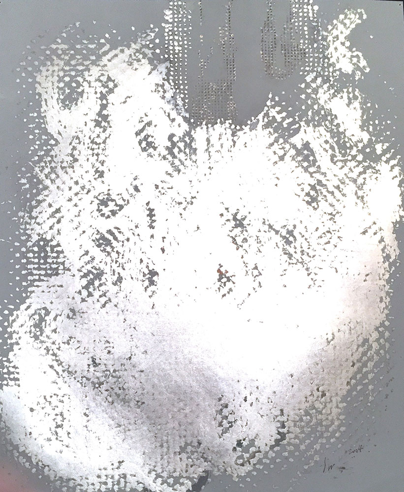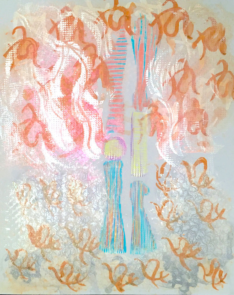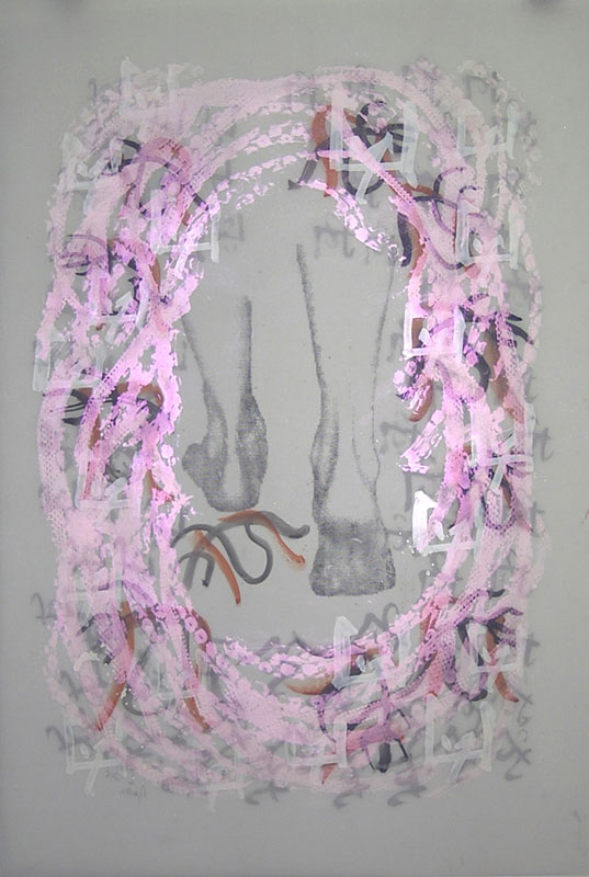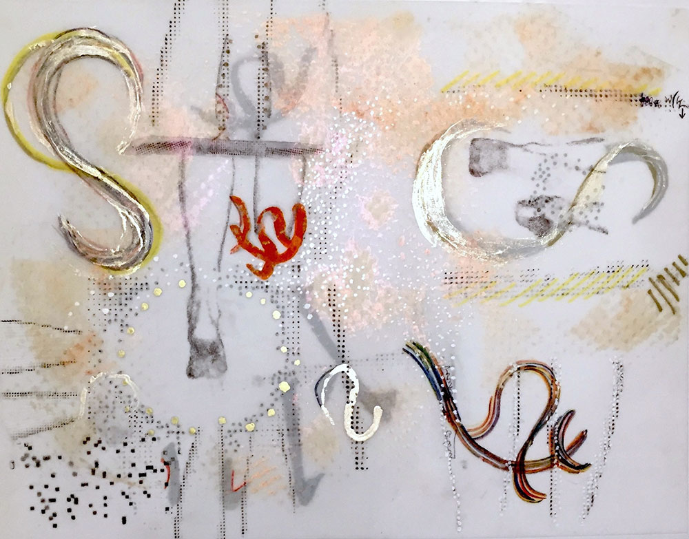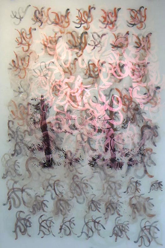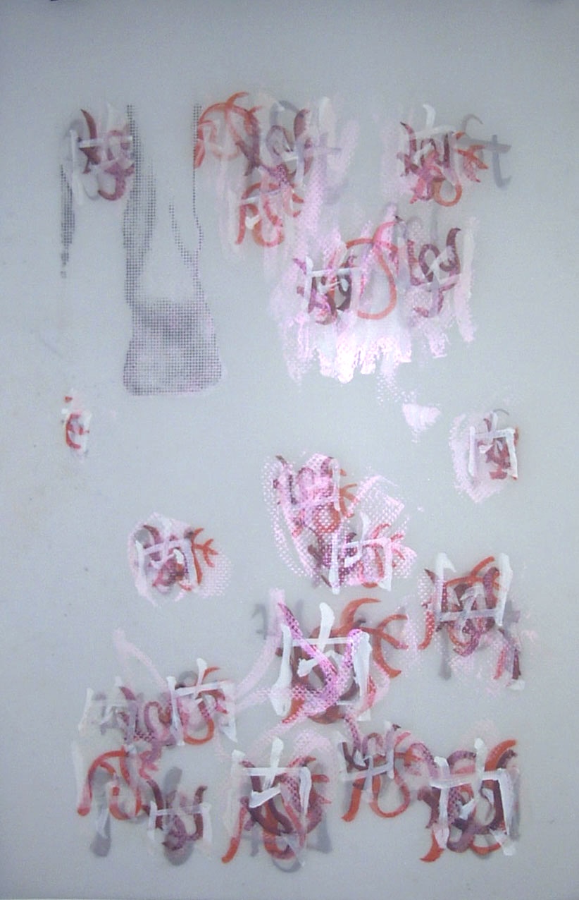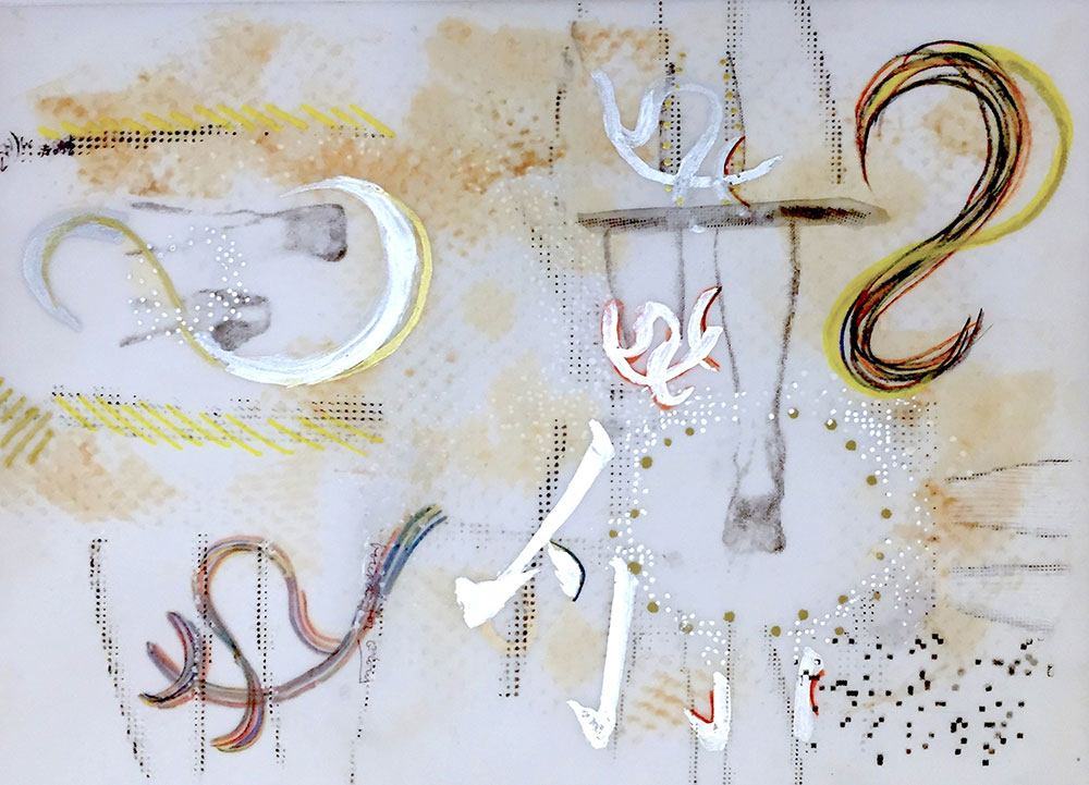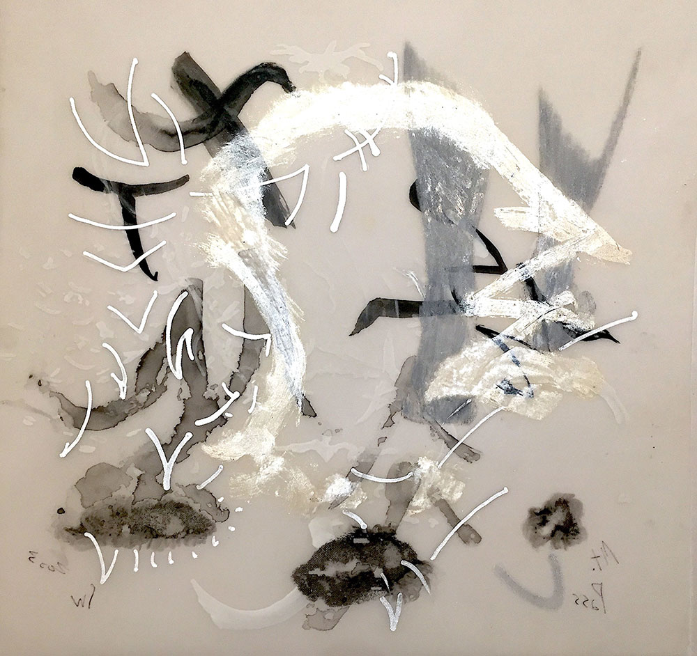 2-sided REVERSIBLE PAINTINGS: xerox transfer, mica powder, Chinese ink, mixed media on brushed mylar